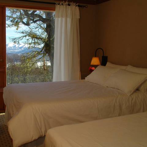 Todas las habitaciones se encuentran distribuidas entre el primer y segundo nivel del hotel y poseen vistas panorámicas al bosque o al volcán Lanín.